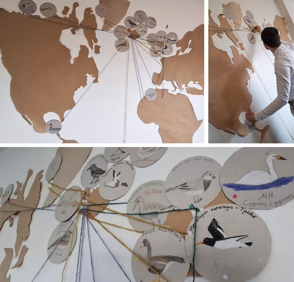 An interactive map is then created in which each participant, representing his or her assigned bird, traces with threads its migratory route, including the origins and trajectories of the birds to their destination in Iceland-Andakill. In this way, a common map is generated that reflects the various migratory routes of the different species.